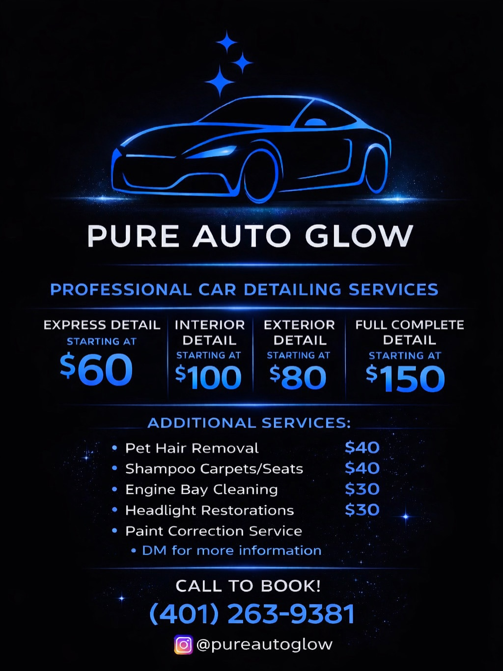 Interior Decontamination and Wipe Down, Stain Removal on All Trim, Complete Vacuum, Floor Mat Cleaning, UV Protectant + Shine Pre-Wash, Foam Wash, Hand Wash, Paint Decontamination, Wheels and Tires, Windows, Door Jambs, Polish and Wax, Smooth and Shiny Finish Vehicle will look BRAND NEW💫.